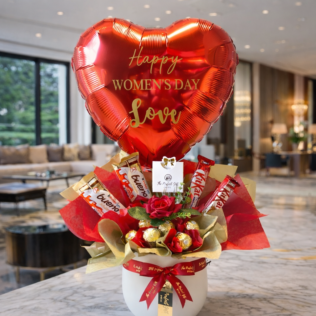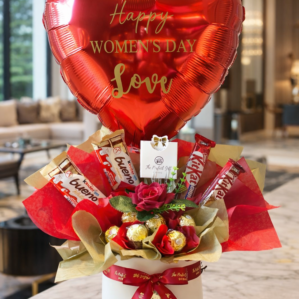 Questo regalo di compleanno divertente e accattivante porterà sicuramente gioia! Sorprendili con questa splendida composizione! Contiene un palloncino in foil a forma di cuore da 18 cm con i tuoi auguri personalizzati, 2 barrette Kinder Bueno, 2 barrette KitKat, 6 Ferrero Rocher e 1 rosa al centro.